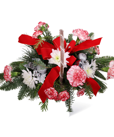 This sweet fresh cut mixed pine basket accented with white snow cap poms and peppermint carnations will be a nice holiday surprise! If watered daily, this arrangement should be enjoyed for many days during this festive time of the year. This basket features mixed white pine, noble tips and flat cedar, mixed colored pine cones, snow cap pomps, peppermint mini and and red carnations!