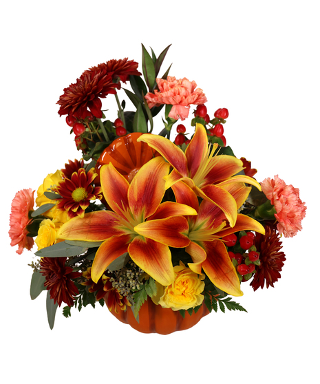 This floral arrangement is a stunning autumn-themed display set in a festive orange pumpkin-shaped vase. Perfect for fall celebrations, Thanksgiving centerpieces, or seasonal home décor!